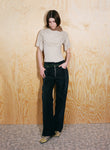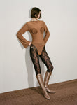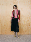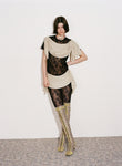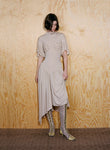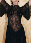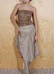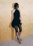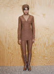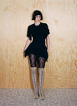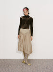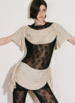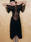 Body-skimming knits, which through woven strips of recycled polyester mimic the latticed decay of shells, and ruched denim dresses consider the poetic repetition of visual and haptic illusions omnipresent in nature. Elsewhere, the embodied silhouettes of Anne Isabella’s signature shimmering body suits and, newly introduced, lace dresses are subtly moved into a textural dimension through the addition of ruffled ammonite spirals.