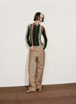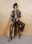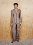 And, as in nature, there is an element of the unexpected, of chance, embraced in discordant harmonies of texture and print: pinks and reds interweave familiar, warped earth-toned stripes; smooth metallics and shell-striped prints are gently fractured by craquelure. Similarly, the streamline tailoring of laser-cut denim suiting is offset by lightly grained, haphazard punctures to the fabric.