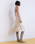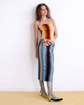 Signature striped knits, made from Ecovero-certified viscose, are reimag- ined in solstitial hues of oranges, blues, and pinks, while monochromatic mini dolly dresses are textured with gently ruffled spirals, a continuationof last season’s ammonites. These romantic silhouettes are balanced by boxy, oversized denim tailoring, textured with laser-printed haphazard stripes and swirls. Two go-go style boots in faux python print complete the collection, each embellished with pop shading of pink or yellow.